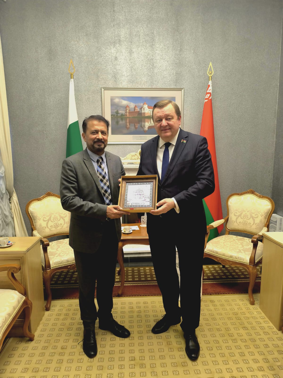 On 29 December 2025, His Excellency, Mr. Muhemmed Aejaz, Ambassador Extraordinary and Plenipotentiary of the Islamic Republic of Pakistan paid a courtesy call on His Excellency Mr. Sergei Aleinik, Chairman of the Standing Commission on International Affairs and National Security of the Council of the Republic of the National Assembly of the Republic of Belarus.